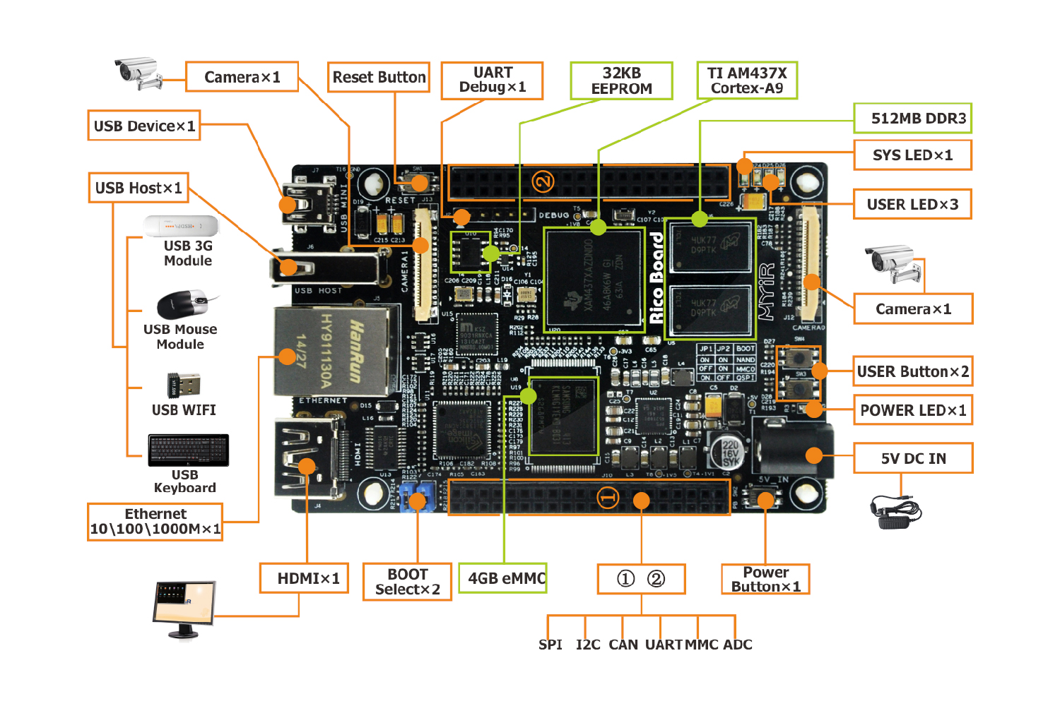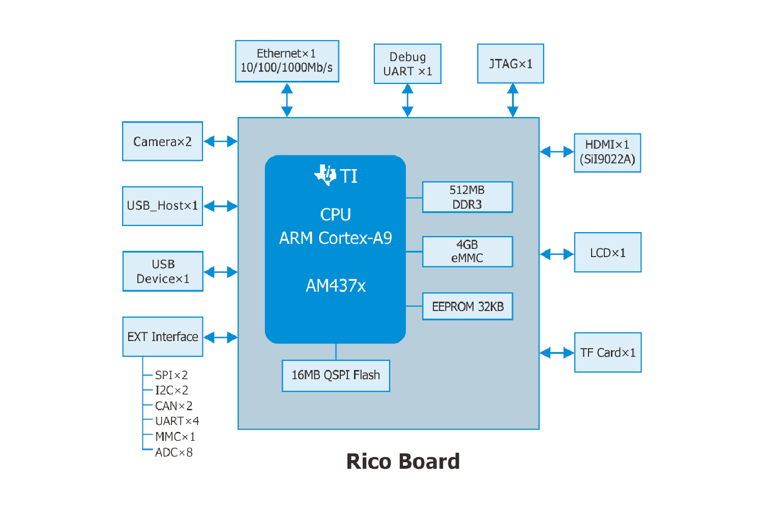 TI AM4378处理器的Rico Board,拥有丰富的数据传输接口HDMI、以太网、Camera、TF Card、USB、串口、JTAG,多样化的交互接口指示灯、按键、扩展接口等。