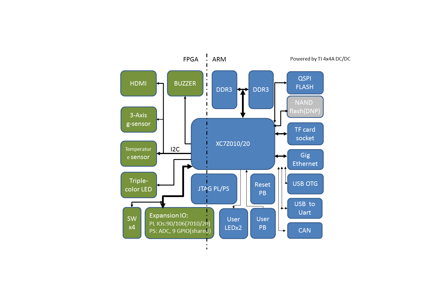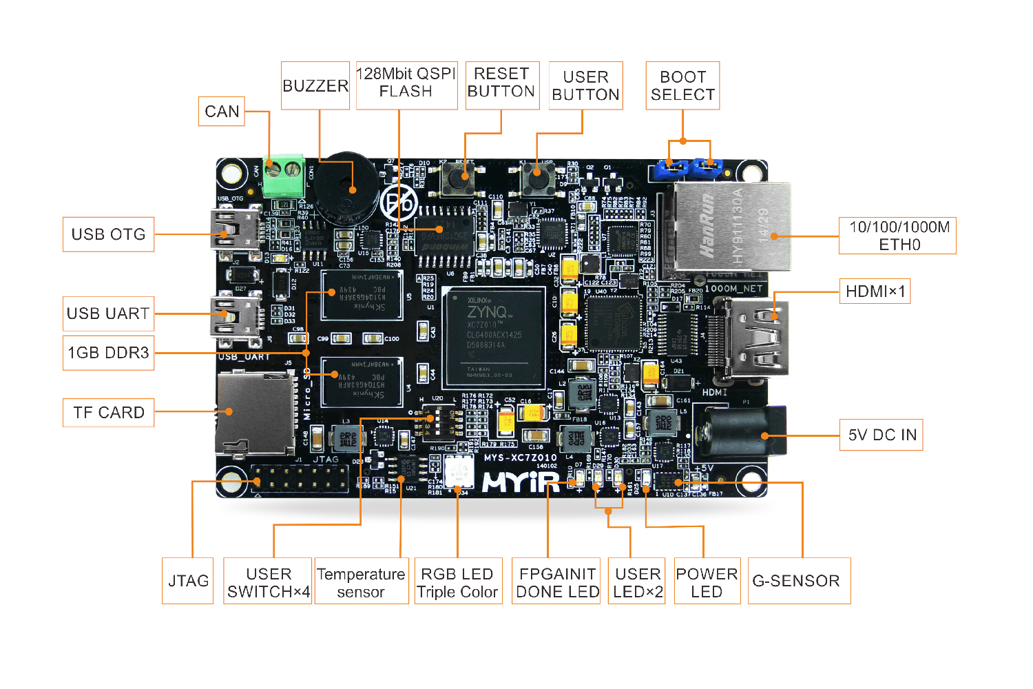 基于Xilinx Z-7000系列单板控制器,支持1 路 MINI USB接口(OTG)、1 路 USB调试串口、1 路HDMI高清输出接口、1 路TF卡接口、1路CAN接口、1路10/100/1000Mbps以太网接口、1个14PIN双排调试接口等等。