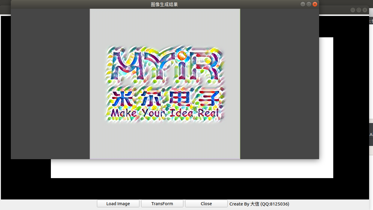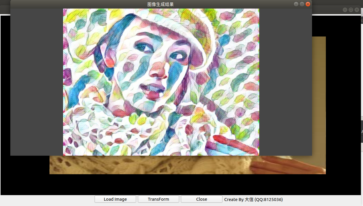 点击 “transform”按钮,等待约13秒,得到风格转移输出画面,如下: