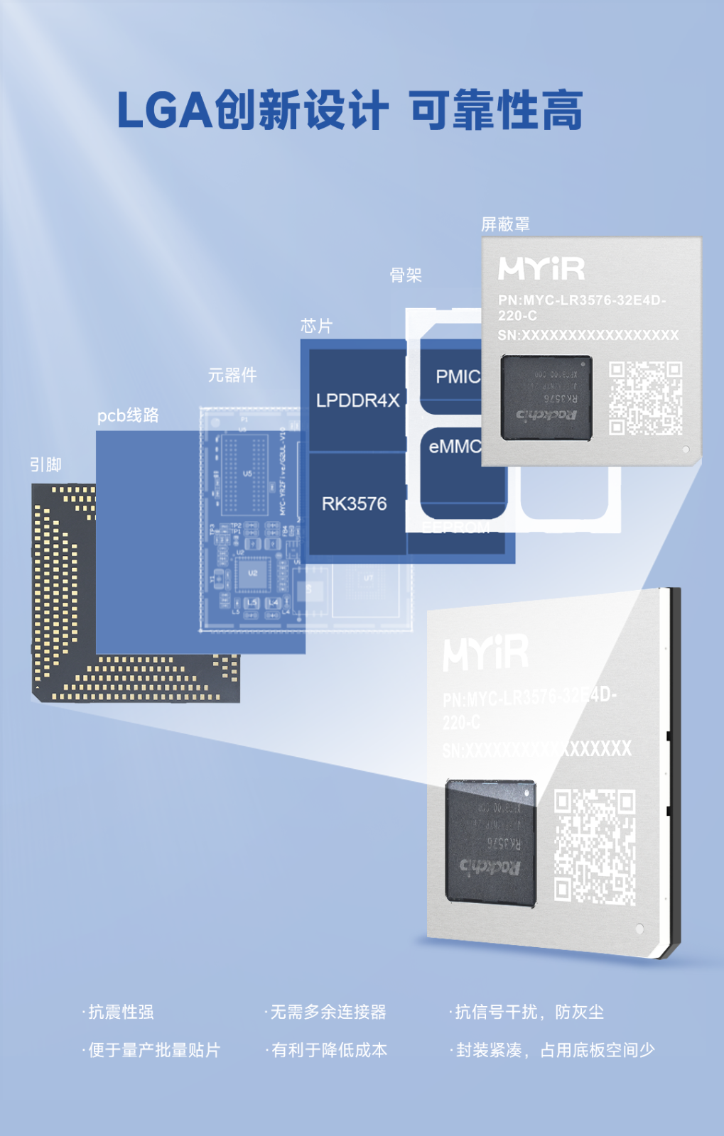 门徒娱乐RK3576核心板采用LGA创新设计,可靠性高,又能节省连接器成本。