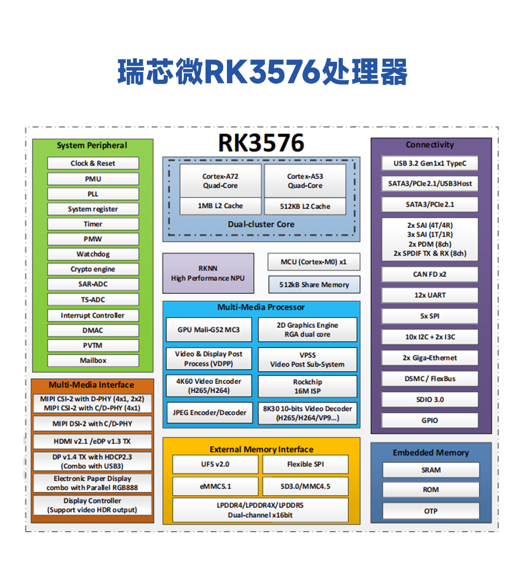 RK3576拥有双千兆以太网接口、PCIE2.1、USB3.2、SATA3、DSMC/Flexbus、CANFD、UART等丰富接口,具备强大的扩展性和兼容性,支持大模型运行和多模态检索功能,处理复杂的监控数据和场景信息。它还支持512Mbps的接入、转发和存储能力,确保数据的高效传输和存储。
