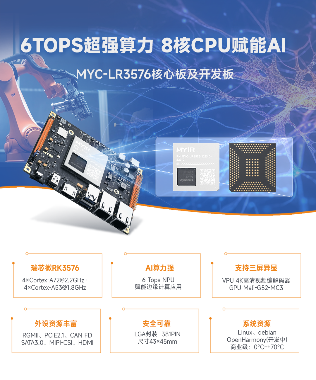 MYC-LR3576J-32E4D-160-I | RK3576J | 4GB LPDDR4X | 32GB eMMC | -40℃~+85℃ 工业级 |