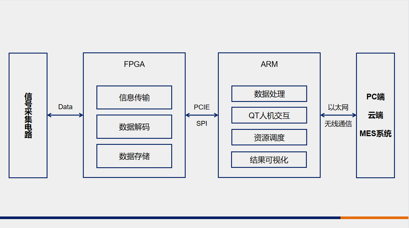 嵌入式人机交互系统:人机交互系统作为整个系统的核心,一方面通过SPI/PCIE发送采集指令信号给到信号控制系统FPGA进行数据采集,数据采集处理后通过SPI/PCIE上传到ARM芯片进行数据处理和分析。另一方面可以通过USB连接鼠标键盘,人工输入指令,进行脚本自动抓取数据,并通过触摸显示系统进行数据结果展示;还可以通过网络上传工业MES+ERP系统,对工业数据进行云存储。