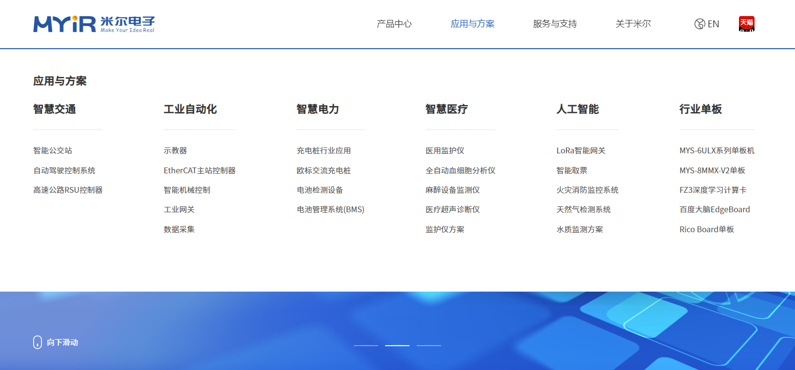 升级改版后的新网站设有产品中心、应用与方案、服务与支持、关于门徒娱乐等5个一级栏目,7个信息分区两大模块。