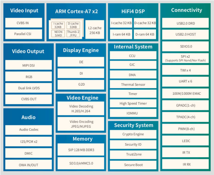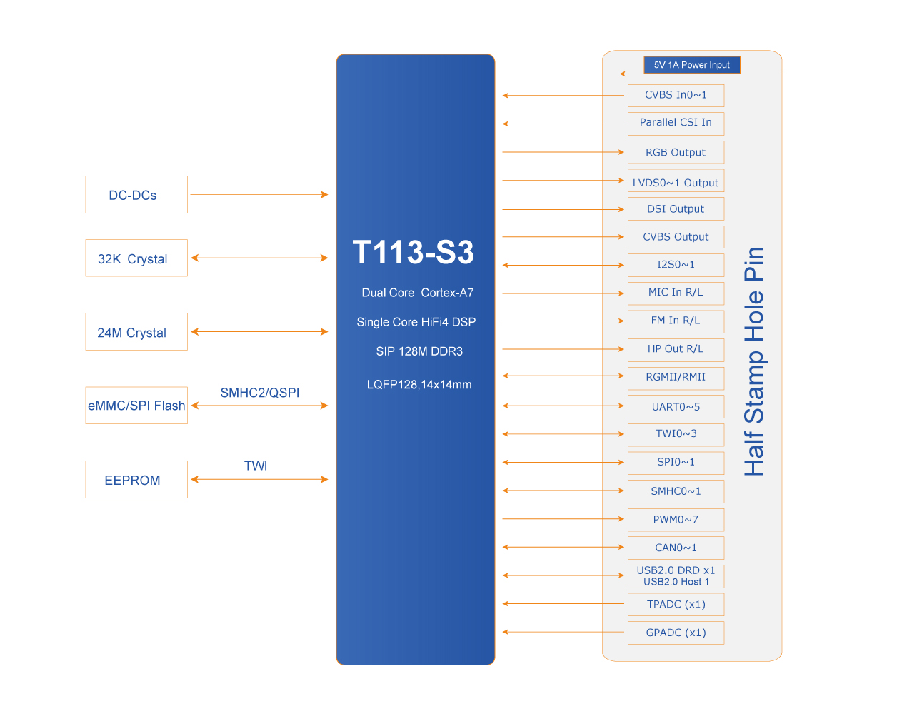 T113-S3是全志科技一款高性价比、入门级嵌入式处理器。T113-S3处理器配备2*Cortex-A7,主频最高1.2GHz,支持视频编解码器、内置128M DDR3。支持H.265/H.264 1080P@60FPS视频解码、JPEG/MJPEG 1080P@60FPS视频编码,具有丰富多媒体接口MIPI-DSI/RGB/LVDS/Parallel CSI,支持1080P@60FPS显示;此外摄像头接口(Parallel-CSI)、显示器接口(MIPI-DSI/LVDS/RGB)、USB2.0接口、CAN接口、千兆以太网等接口,适用于物联网网关、商业显示、能源电力、工业控制、医疗器械等场景。