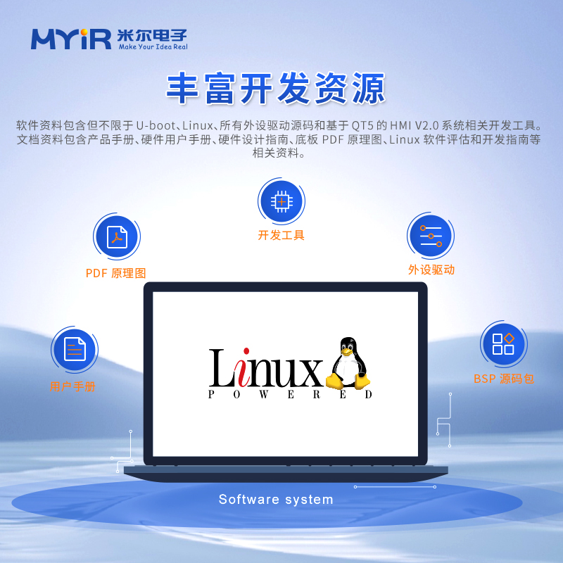 门徒娱乐T113-S3的核心板,随同开发套件MYiR提供了丰富的软件资源以及文档资料。软件资料包含但不限于U-boot、Linux、所有外设驱动源码和相关开发工具。文档资料丰富,MYiR旨在为开发者提供稳定的参考设计和完善的软件开发环境,能够有效帮助开发者提高开发效率、缩短开发周期、优化设计质量、加快产品研发和上市时间。