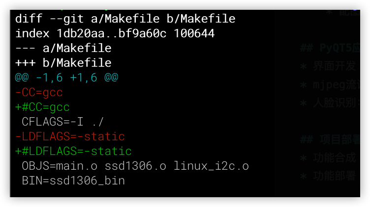 make ls -l ssd1306_bin # 部署文件到开发板 scp ssd1306_bin root@192.168.1.177:~/mjpeg_server/