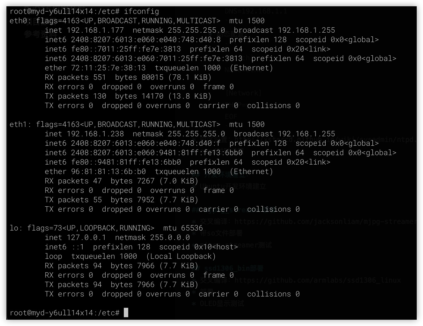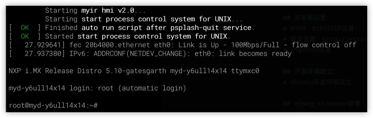 ssh root@192.168.1.177# 出现下一行提示附后,就可以输入命令了:root@myd-y6ull14x14:~#root@myd-y6ull14x14:~# uname -aLinux myd-y6ull14x14 5.10.9-1.0.0+g062cea228 #1 SMP PREEMPT Fri Aug 12 02:04:17 UTC 2022 armv7l armv7l armv7l GNU/Linux