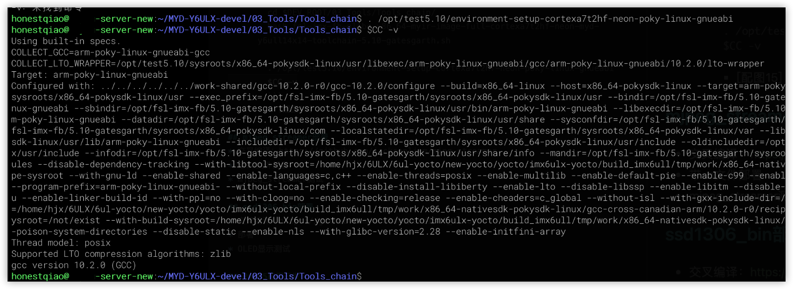 cd $DEV_ROOT/03_Tools/Tools_chain/ bash fsl-imx-fb-glibc-x86_64-myir-image-full-cortexa7t2hf-neon-myd-y6ull14x14-toolchain-5.10-gatesgarth.sh . /opt/test5.10/environment-setup-cortexa7t2hf-neon-poky-linux-gnueabi $CC -v