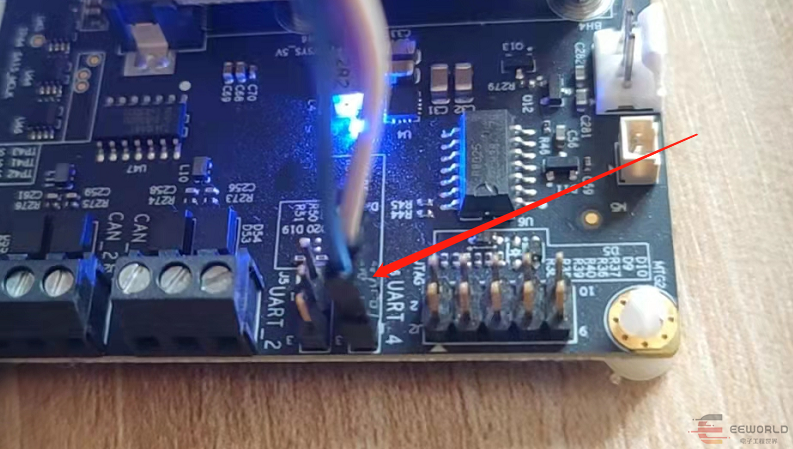 2、UART4口为J6,下图中红色箭头指示位置为pin1即UART4_TXD,据此pin2即UART4_RXD,pin3为GND。接这3根线就可以。
